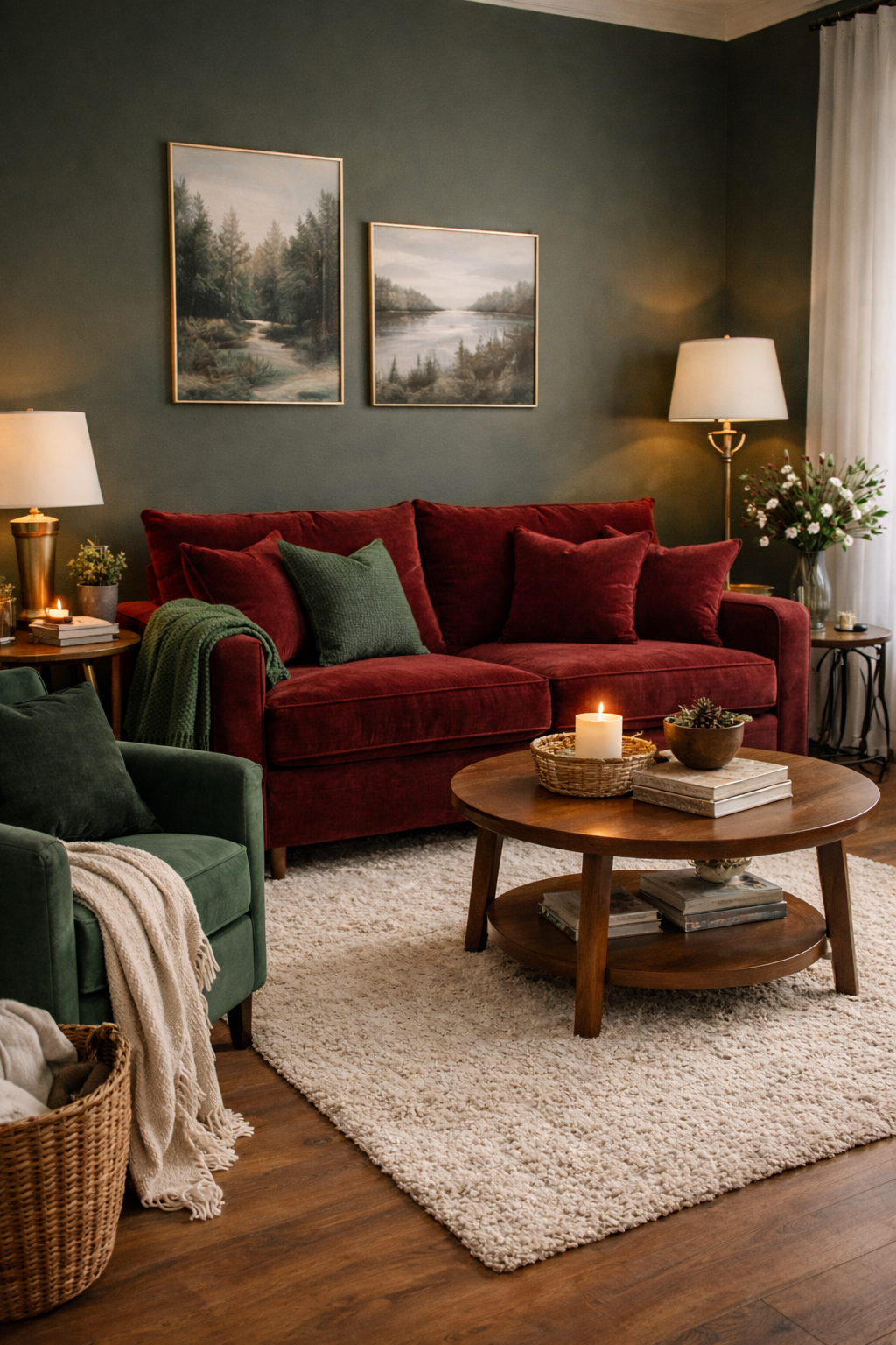 Think deep forest greens paired with rich burgundy, or muted sage alongside soft clay reds. Suddenly the combination feels grounded, warm, and timeless rather than seasonal. It’s not about avoiding the colours it’s about choosing the right shades and letting them breathe.